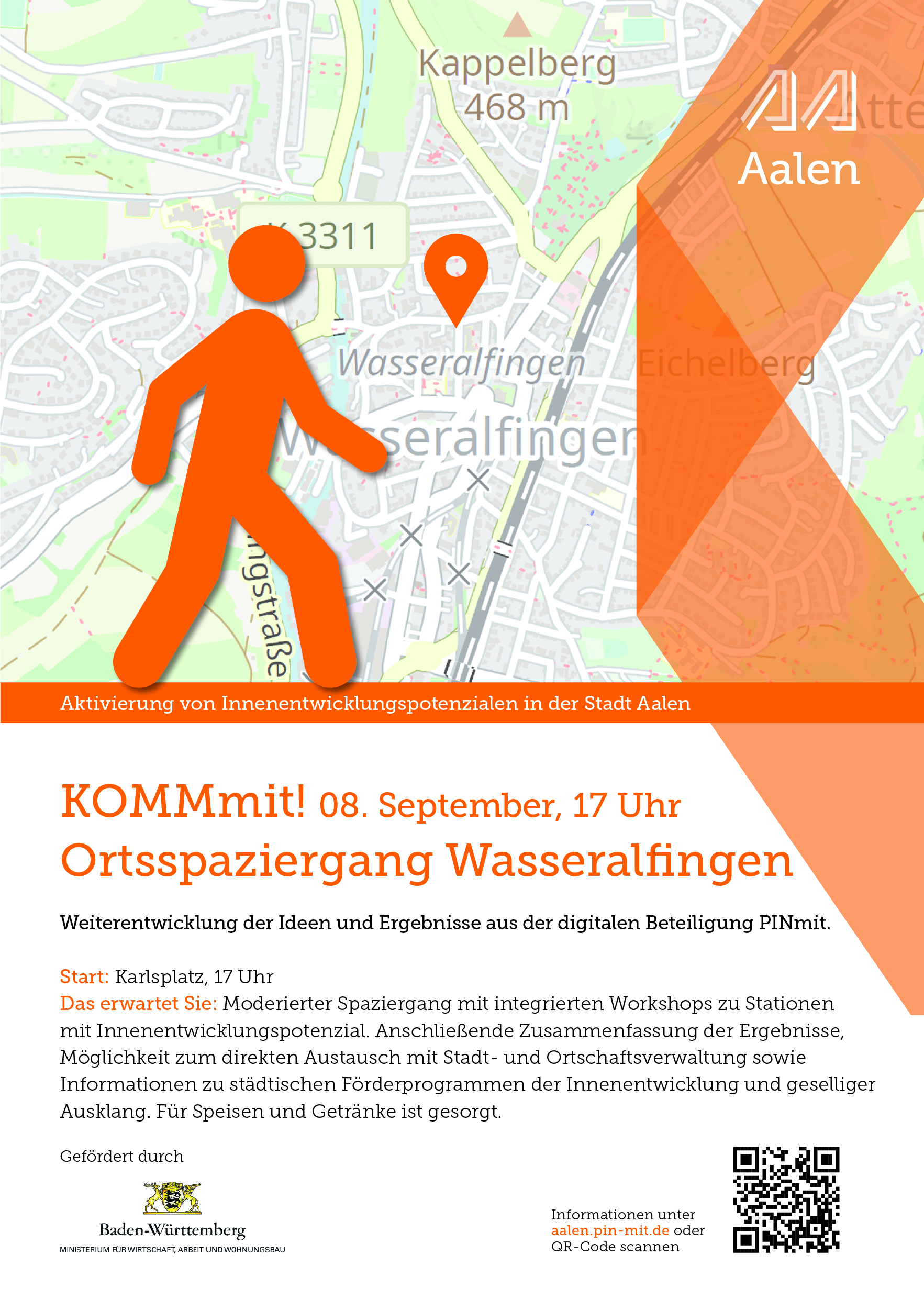 • Vor-Ort-Spaziergänge mit -Werkstätten | Juli bis Oktober 2021: Gemeinsam mit Ihnen werden wir bei einem Ortsteilspaziergang mit anschließender Werkstatt weitere Ideen zur Aktivierung von Innenentwicklungspotenzialen sammeln und ausarbeiten. Der Ortsteilspaziergang in Waseralfingen findet am Mittwoch, 8. September 2021 ab 17 Uhr statt. Der Startpunkt befindet sich am Karlsplatz.